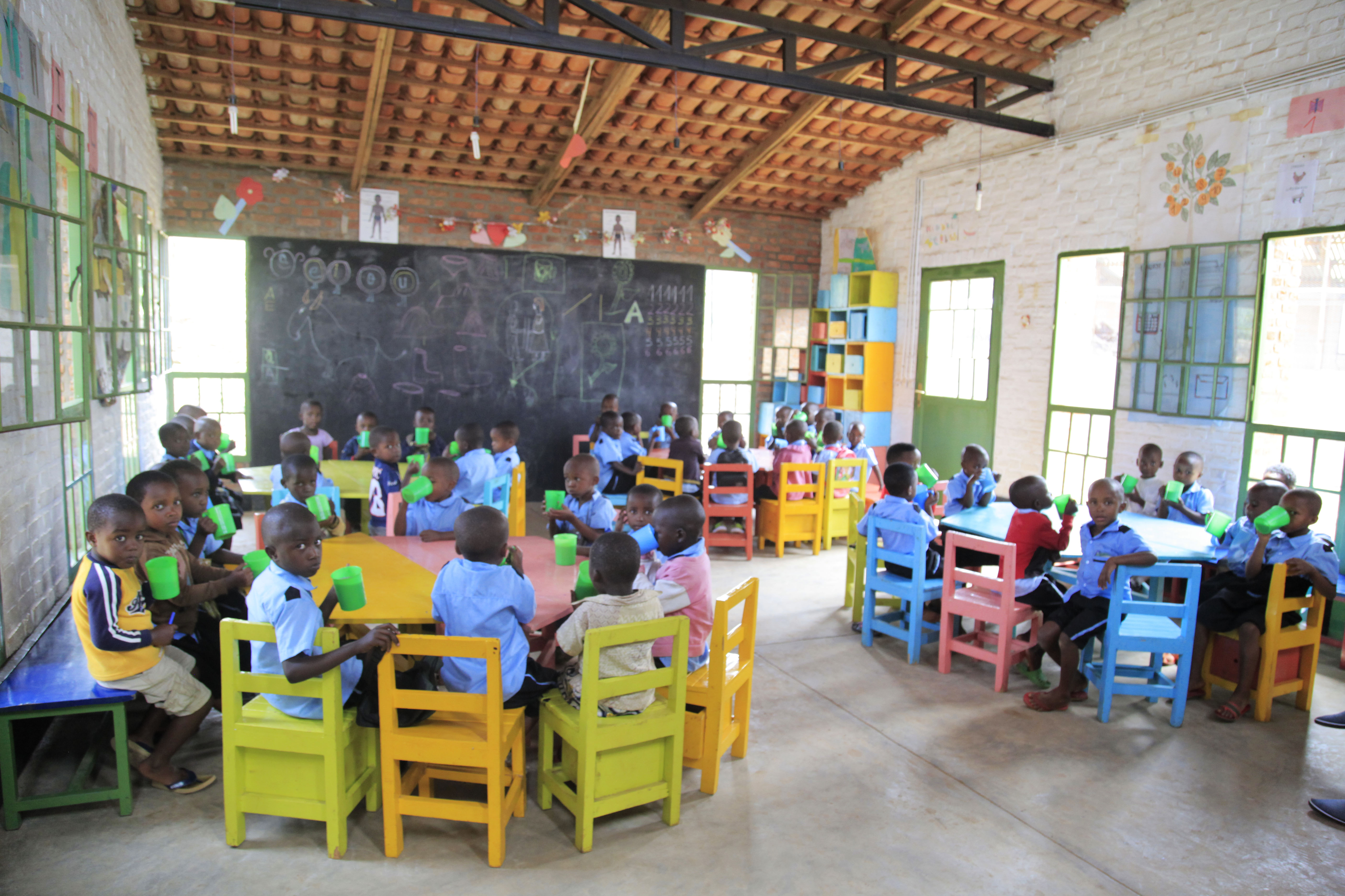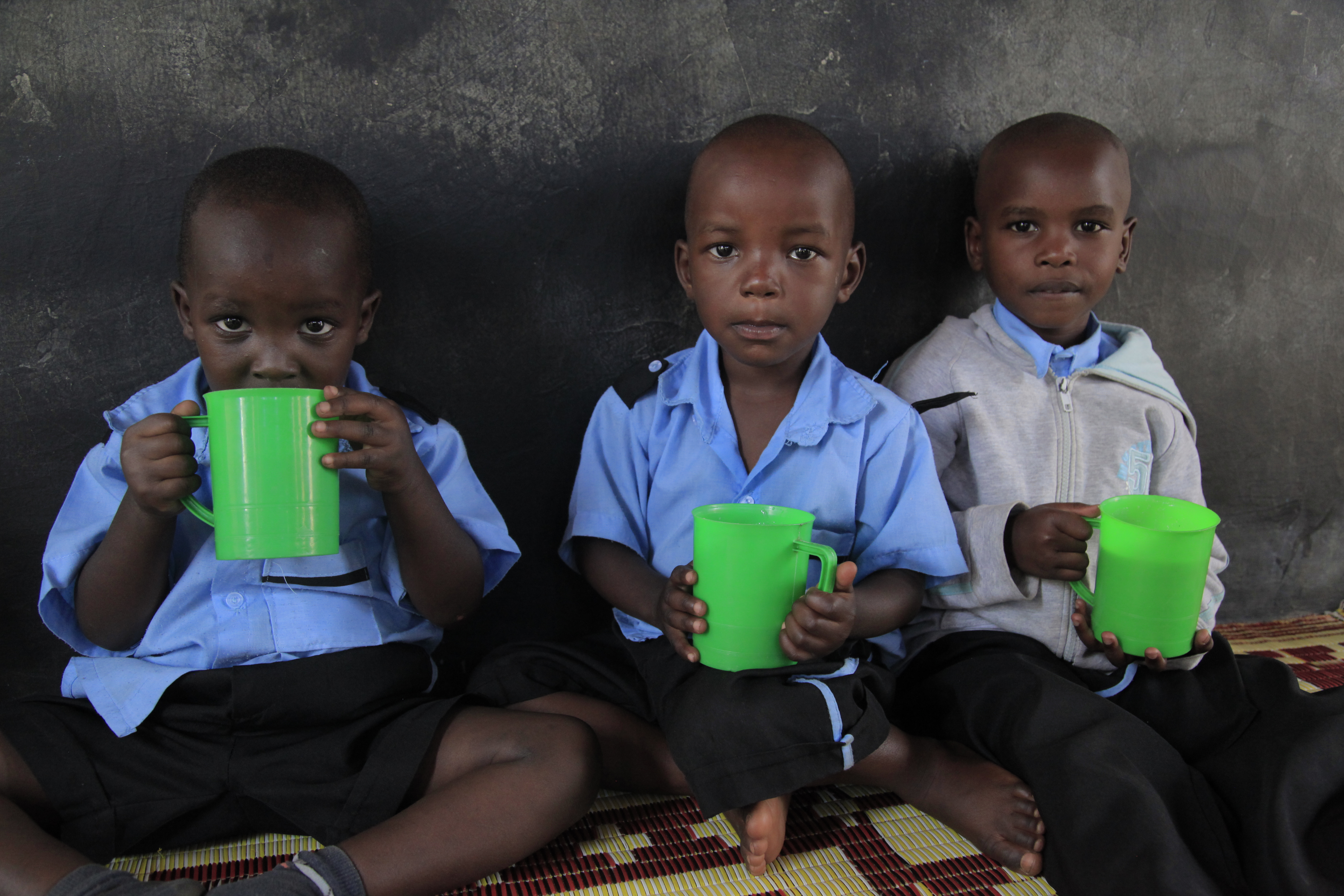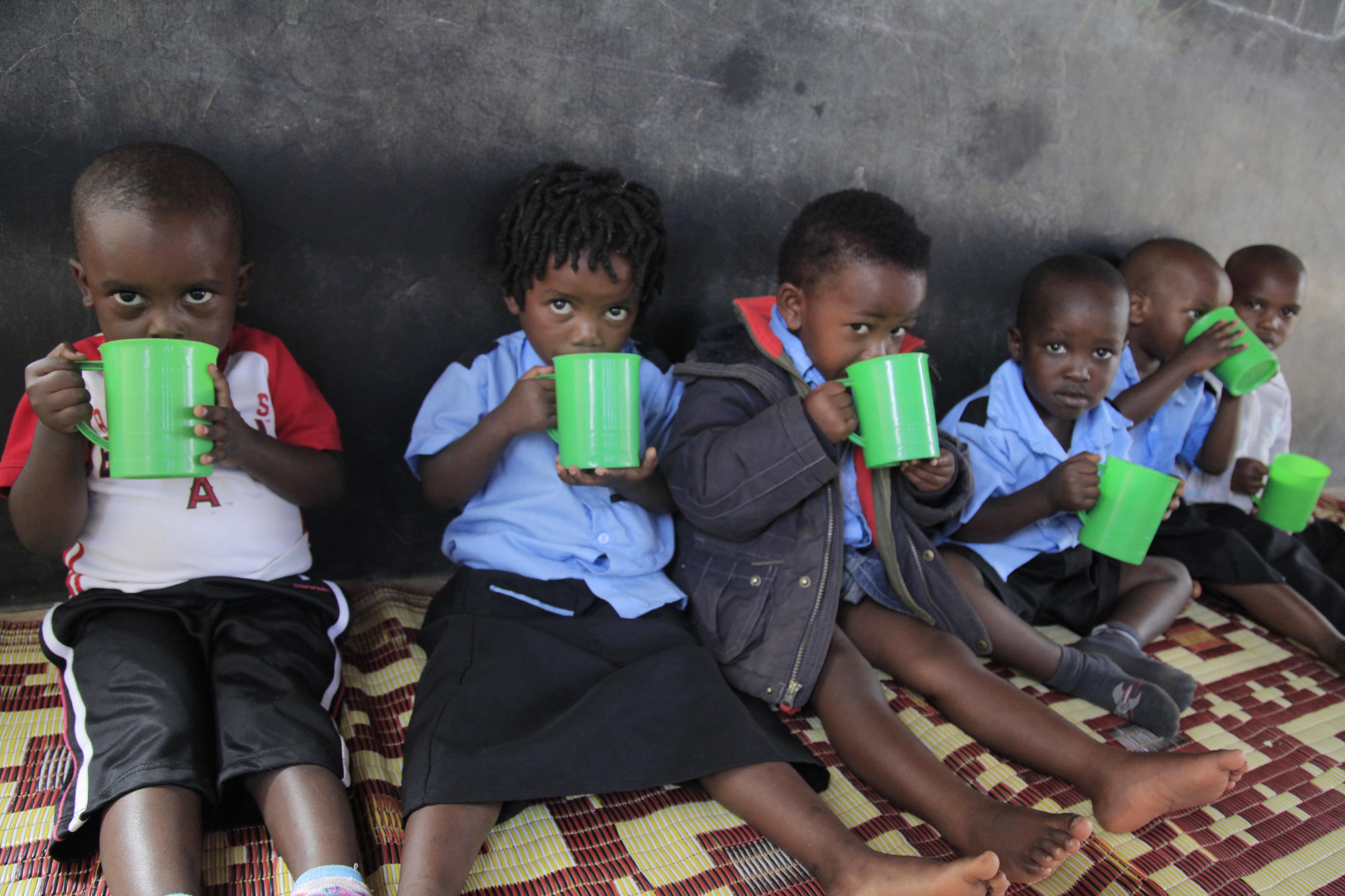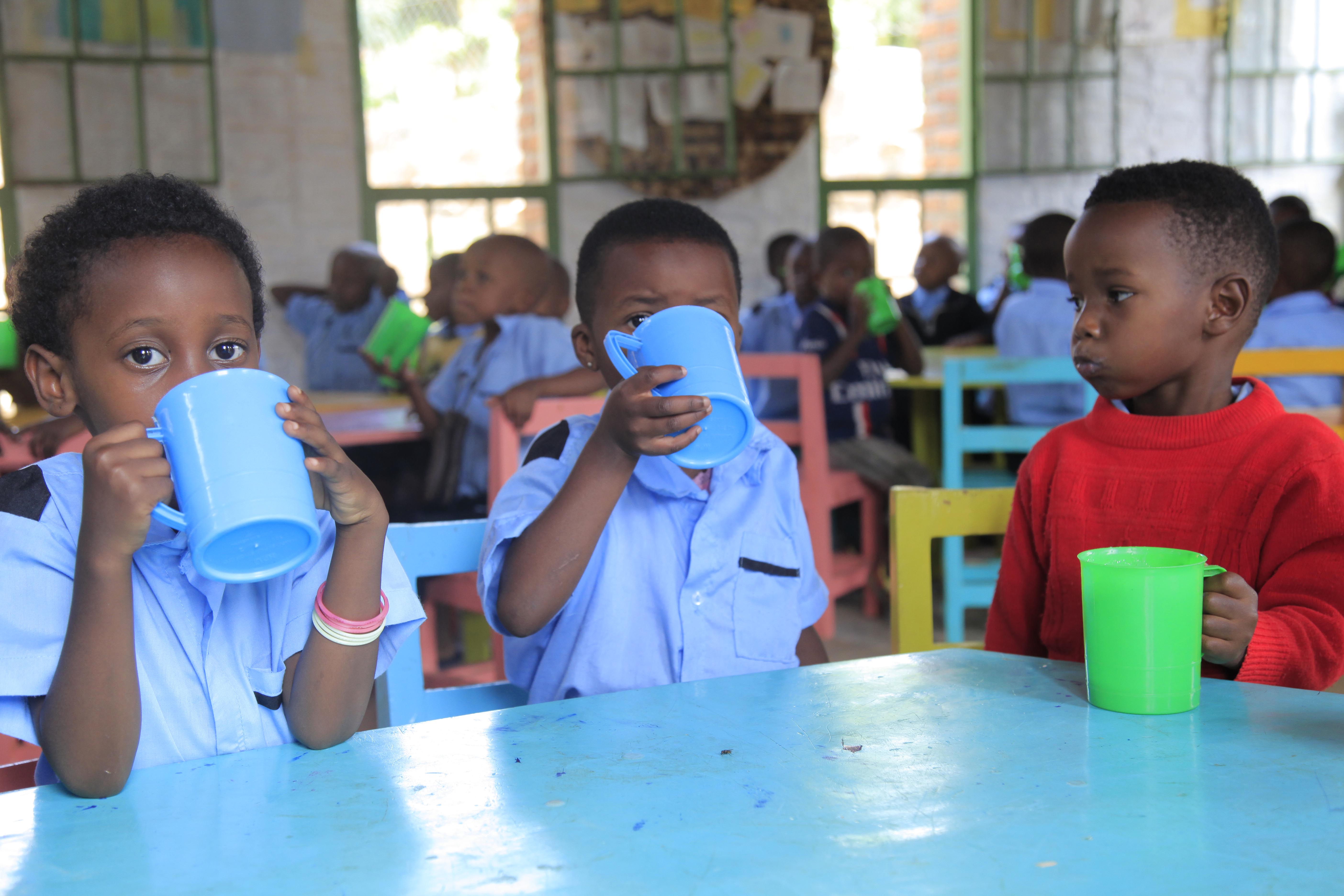 Children drink milk at school during a national program of One Cup of Milk per Child