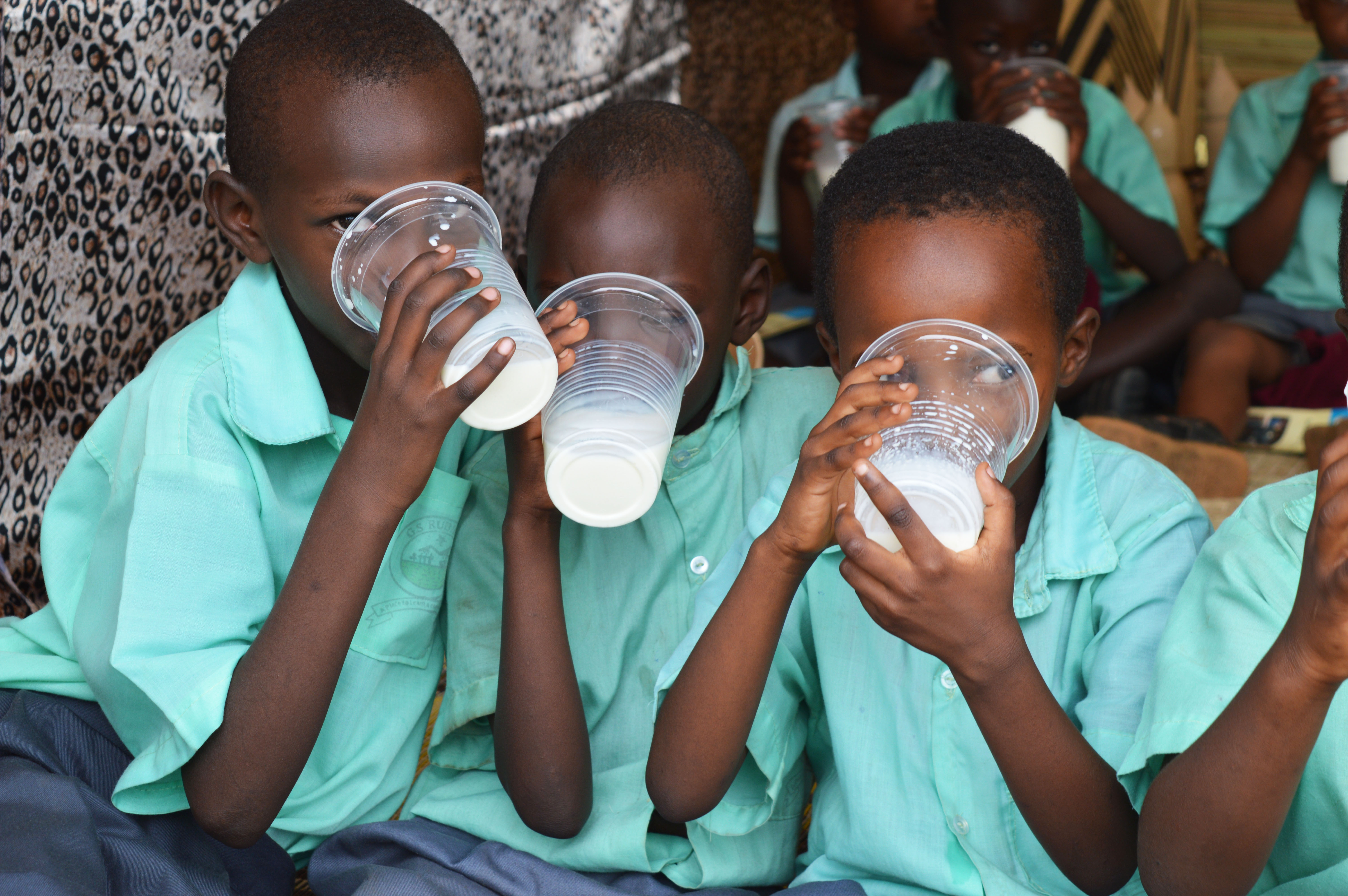 Children drink milk at school during a national program of One Cup of Milk per Child