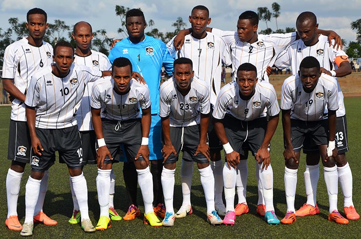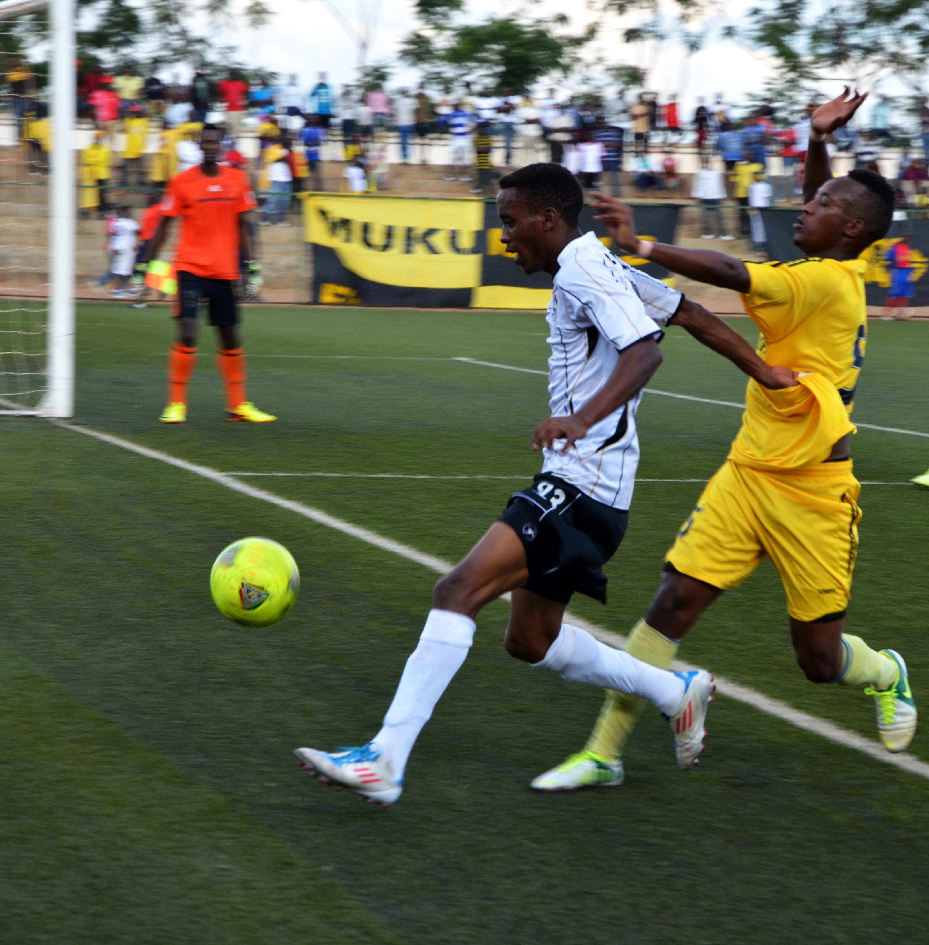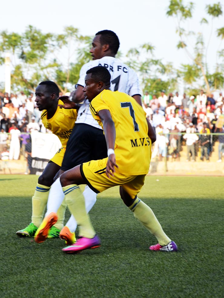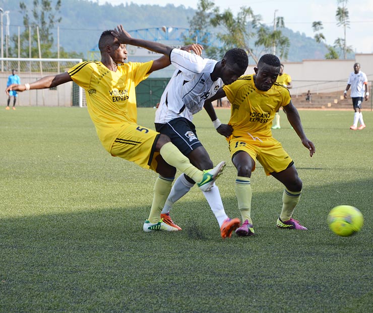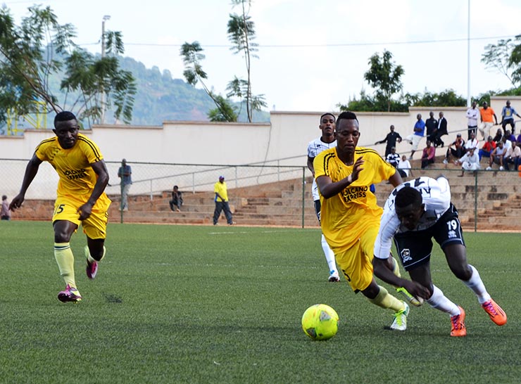Sibomana Patrick with two defenders of Mukura getting ready to recieve the the pass (by Samuel Ngendahimana