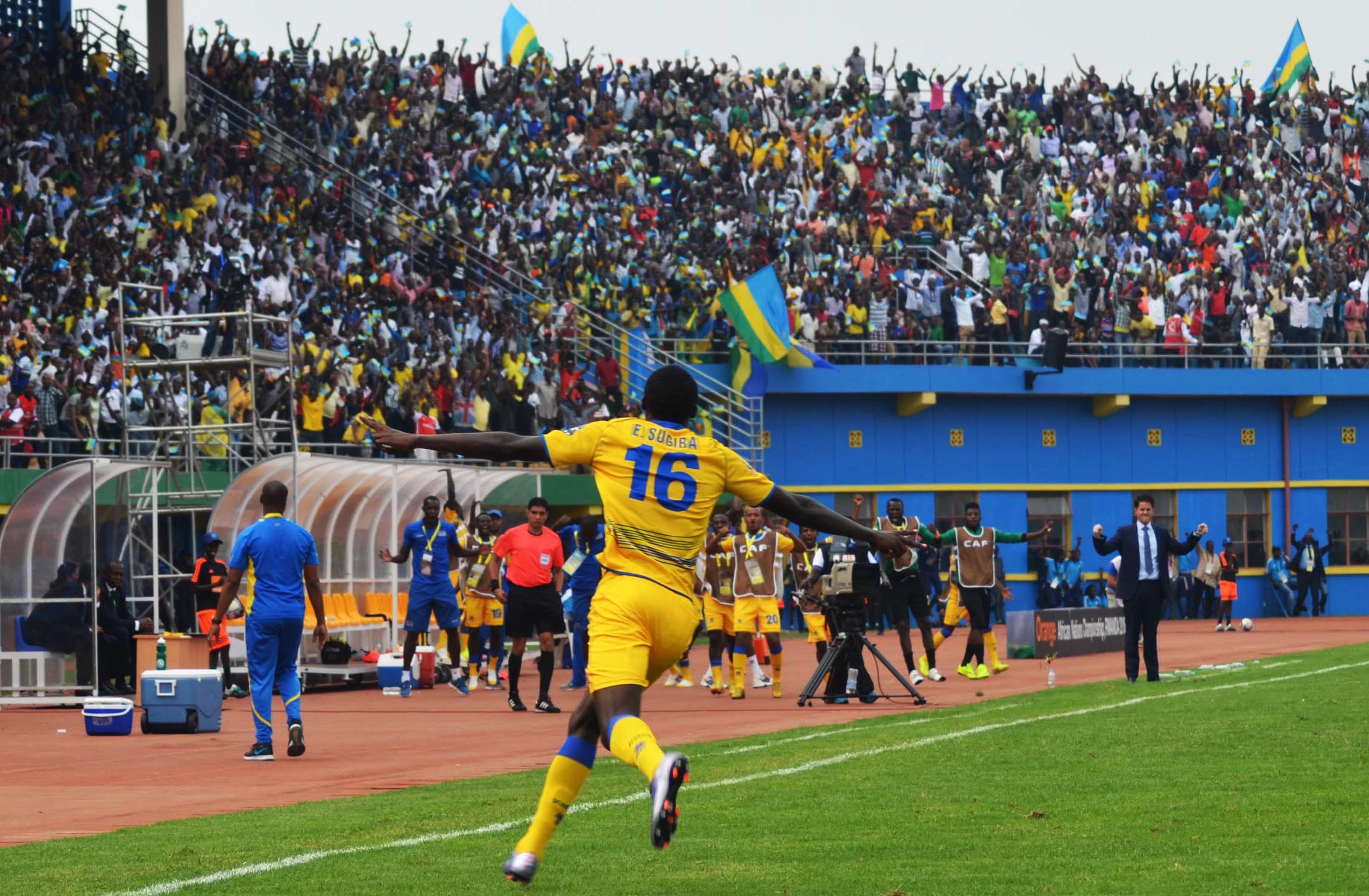 A,mavubi striker Ernest Sugira celebrates his goal in the CHAN, held in Rwanda in January 2016