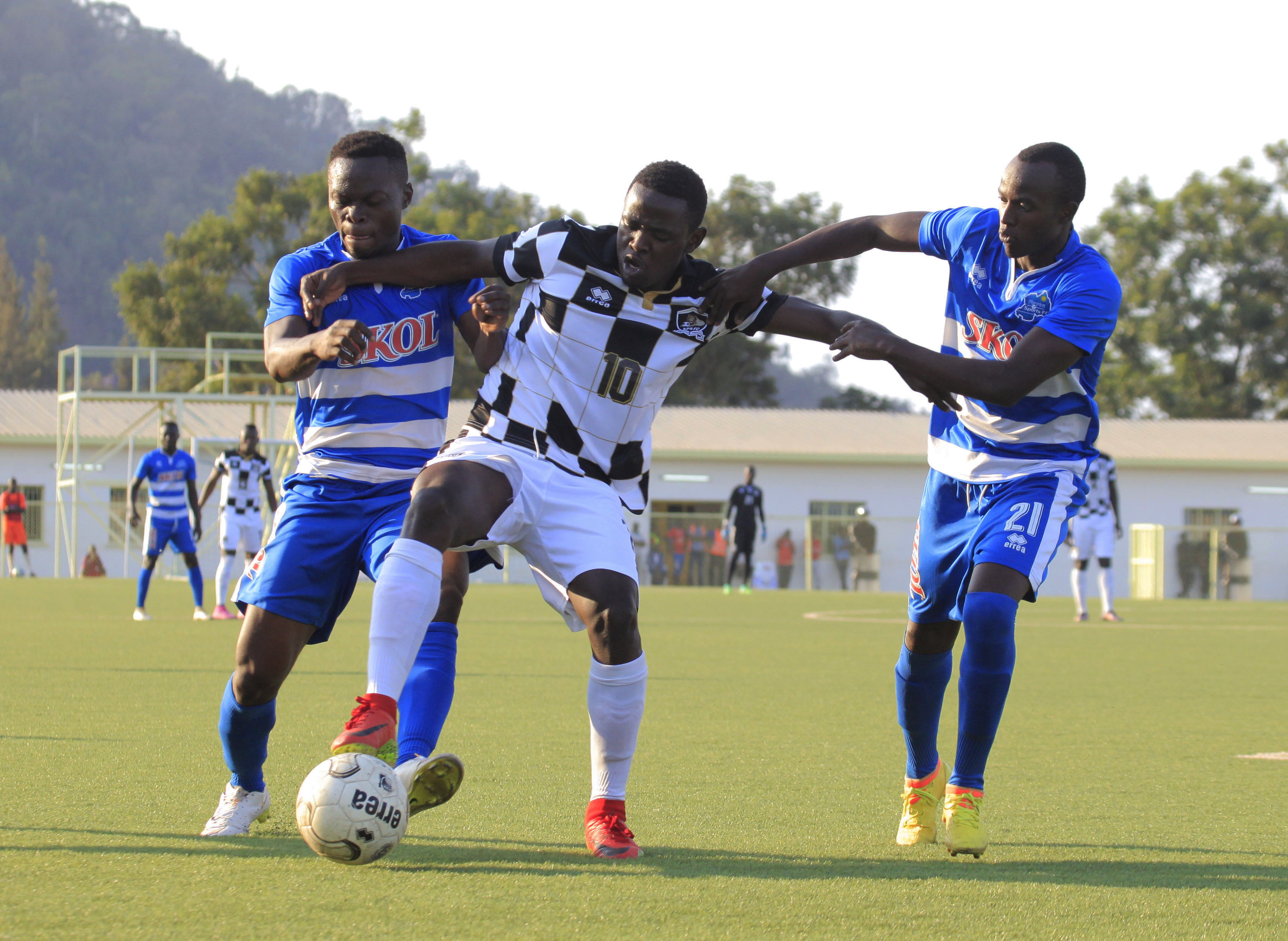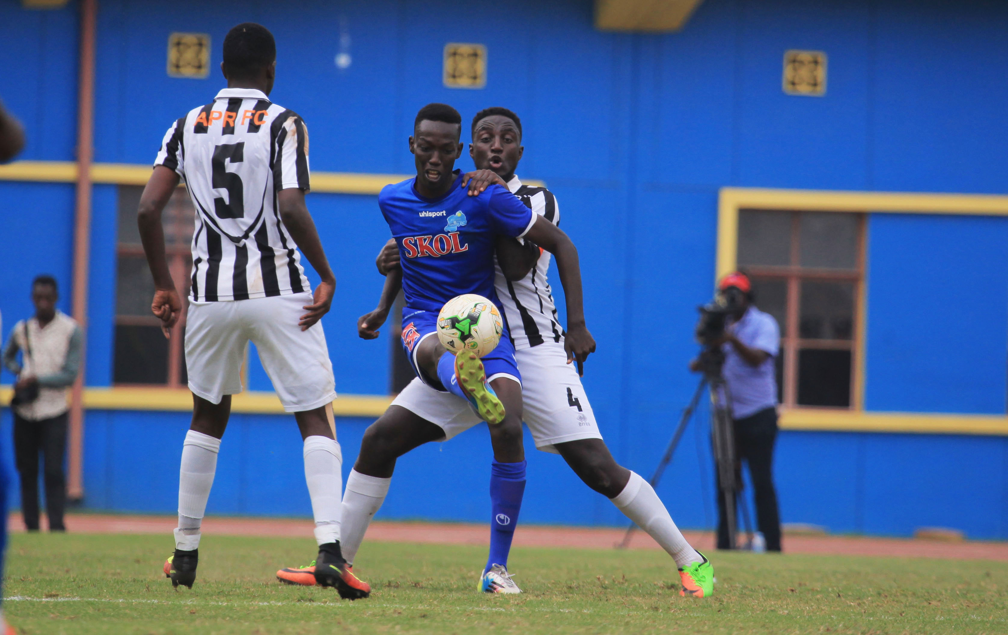APR FC attacking midfielder battles for the ball against Rayon Sports midifielder Kwizera Pierrot and Irambona in a 1-1 draw at Kigali Stadium