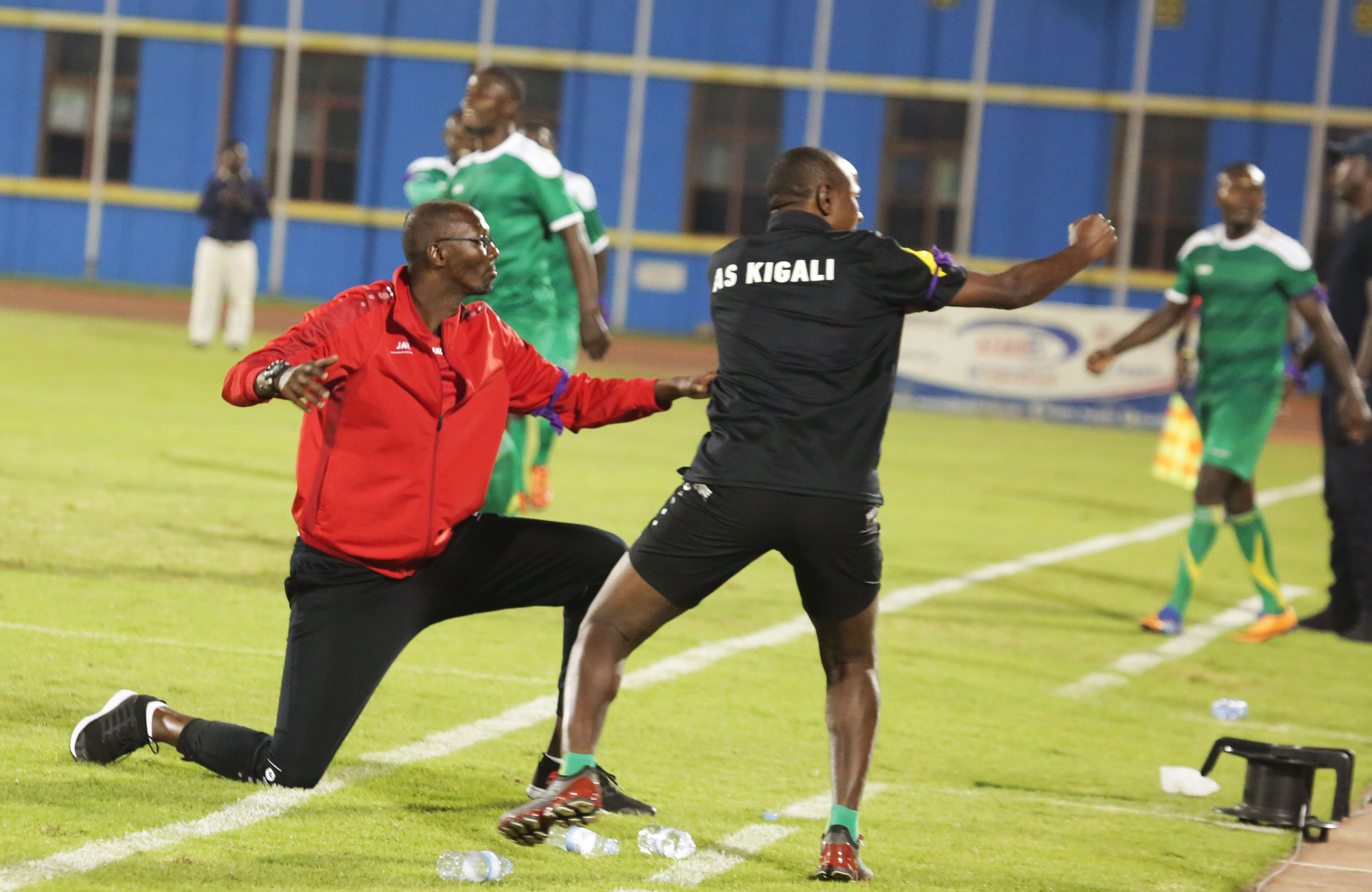 AS Kigali head coach Eric Nshimiyimana and his assistant celebrate a crucial win 1-0 against Rayon Sports at AmahoroNational Stadium
