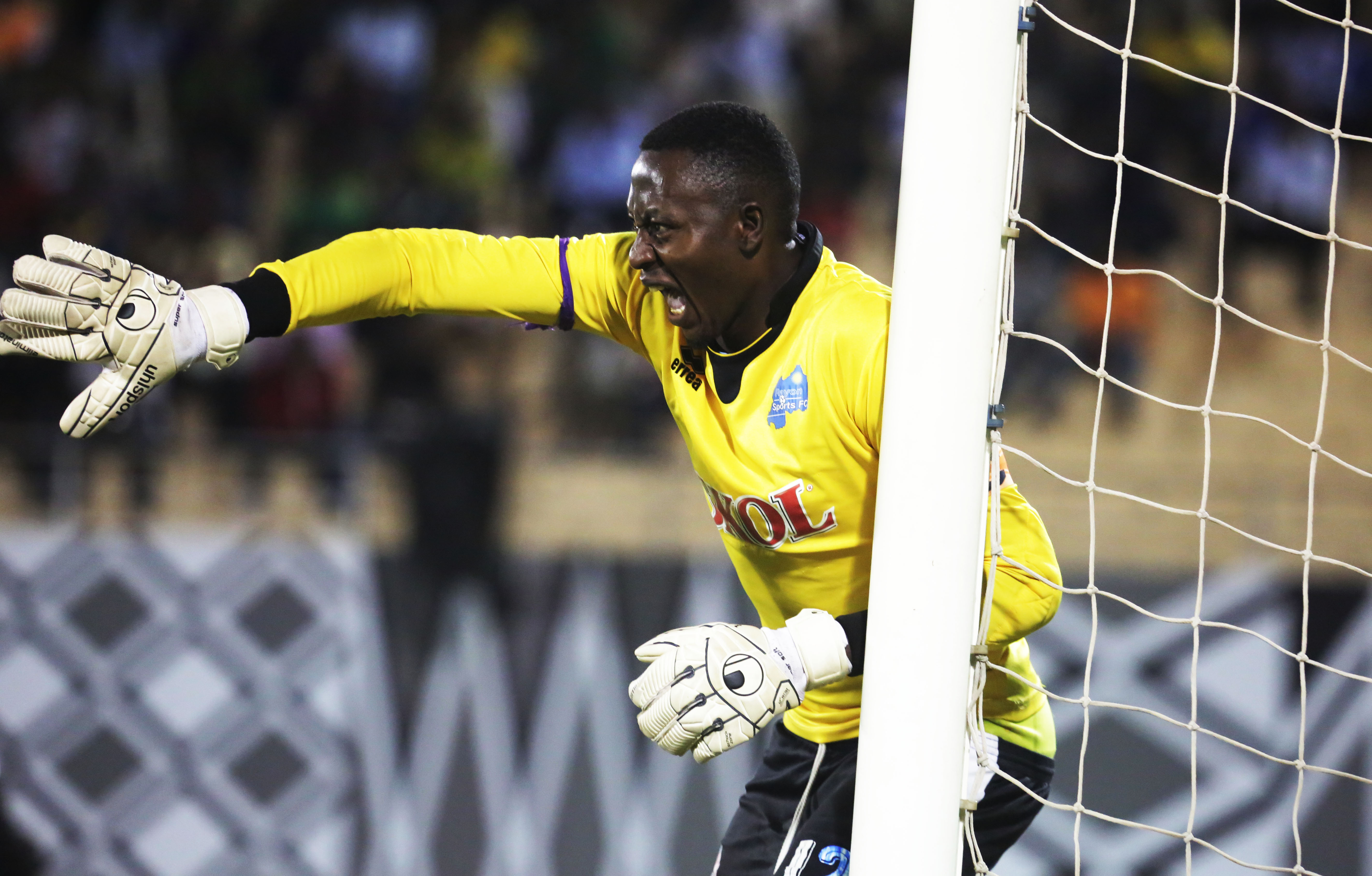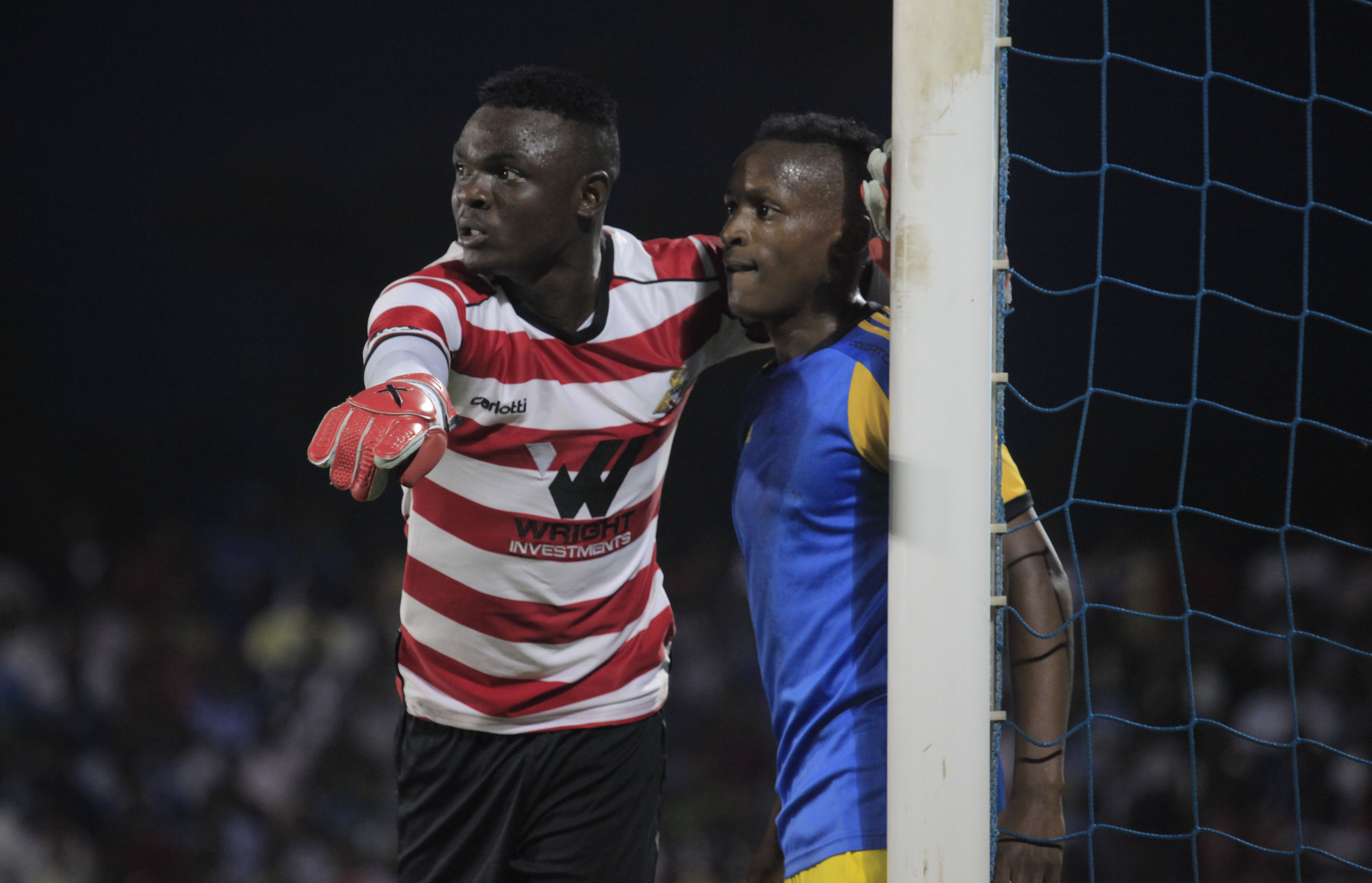 Amagaju goalie Gadi Muhawenayo asks his teammates to be vigilant in a recent league match
