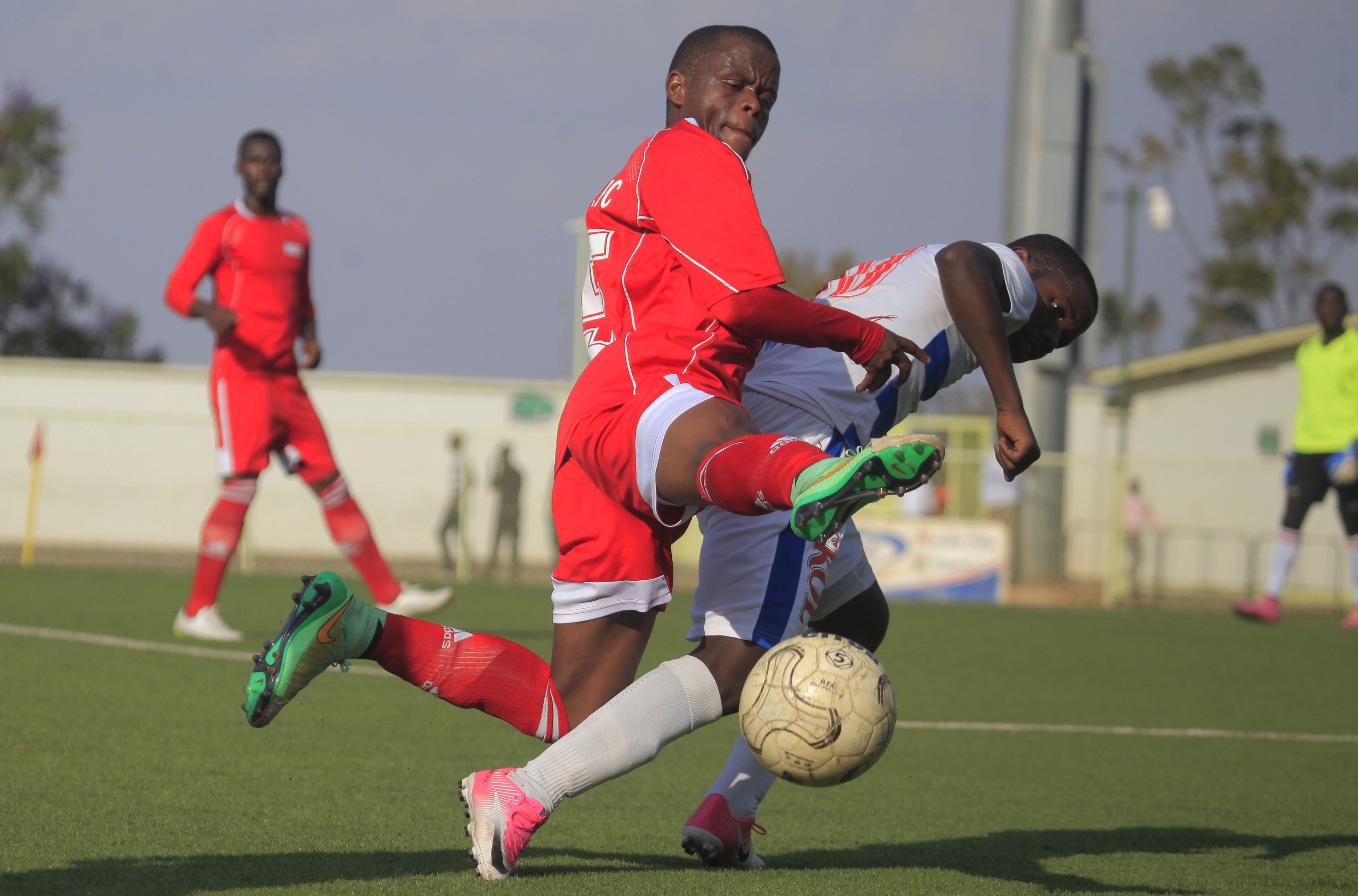 Espoir’s defender Jacques Wilondja vies for the ball with Rayon’s Shassir Nahimana Stade de Kigali Stadium