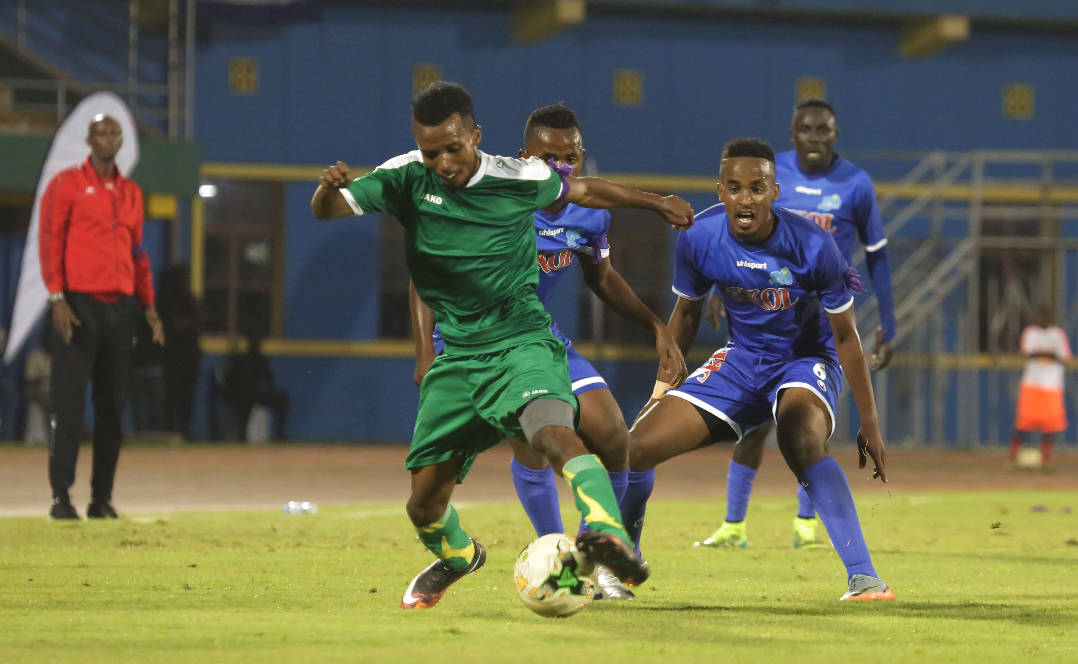 Rayon Sports goalkeeper Jean Luc Ndayishimiye calls for his teammates to stay vigilant as Law enforcers team get a free kick