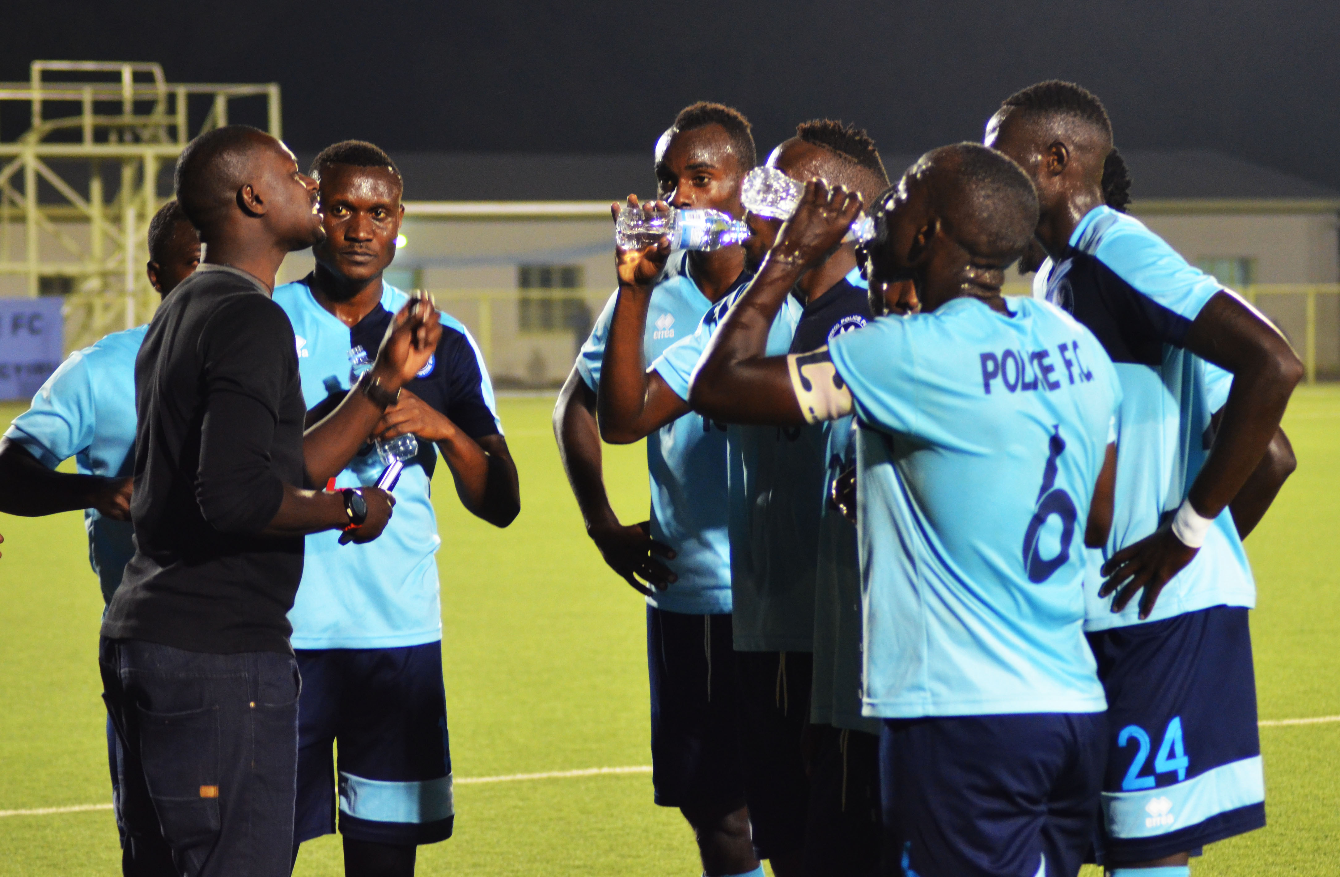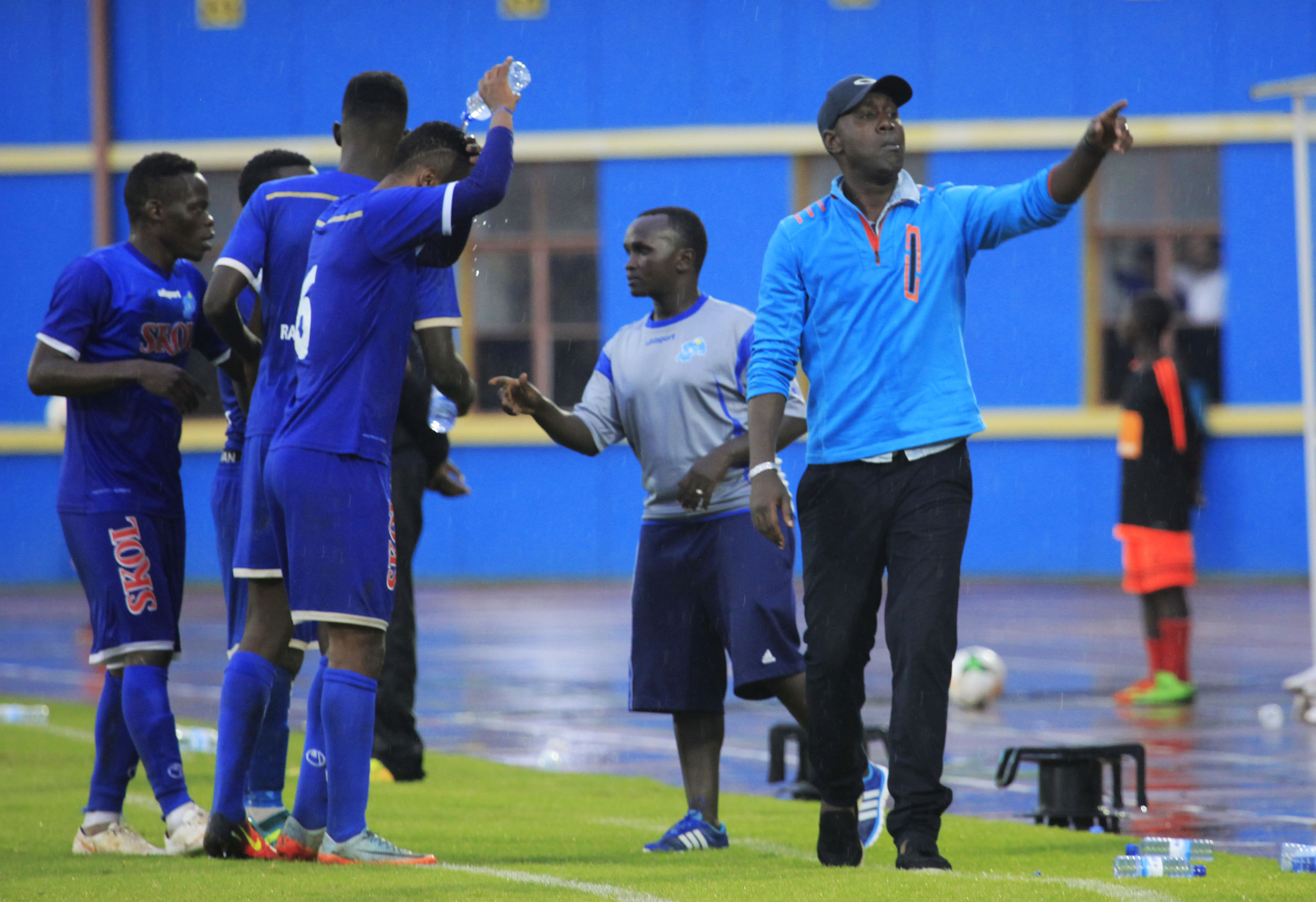 Police FC manager Innocent Seninga talks to his giants during the match at Kigali Stadium