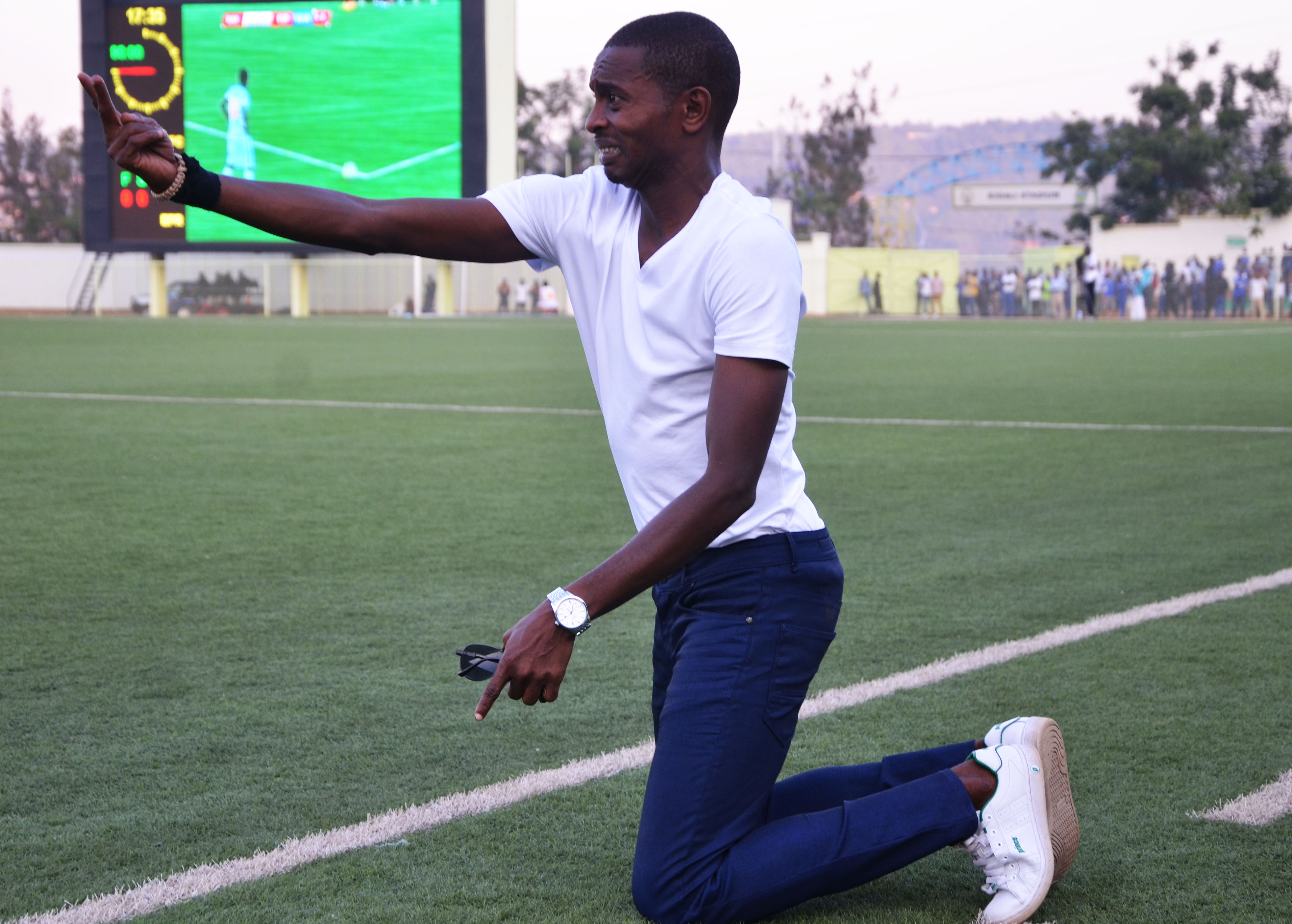 Rayon Sports coach Djuma Masudi kneels down to better control the movements of his team.